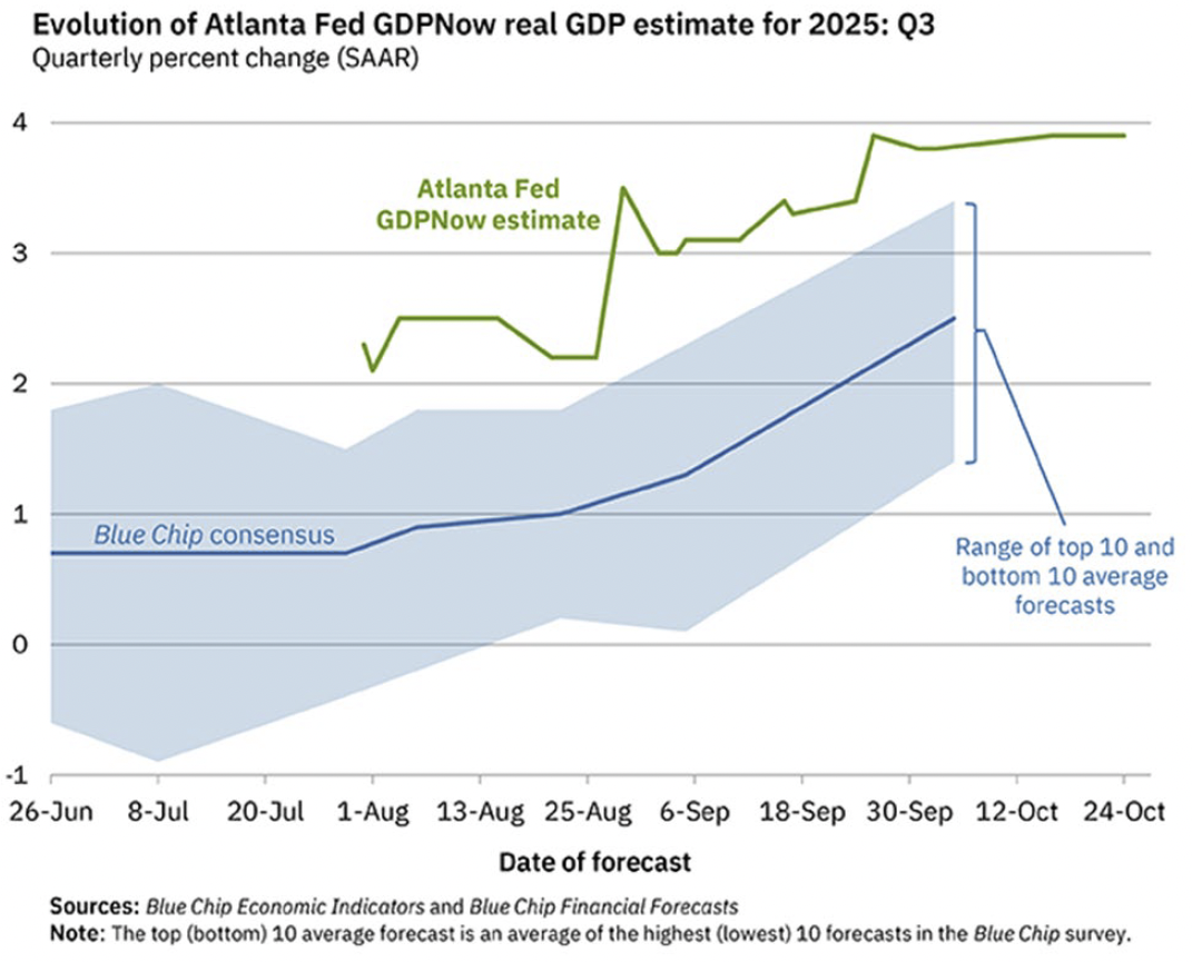 Ghost in the machine.  We should not ignore the resoundingly strong fundamentals that continue to underpin today’s capital markets.  For all of the thinking about the inevitability of recession over the last few years, the U.S. economy continues to motor.  As shown in the chart below, “Blue Chip” economists forecasts (blue line below) are now scrambling to catch up to the reality that the data (green line) has been implying for months now.  Expect more of the same as we continue through 2025 Q4 to the end of the year.