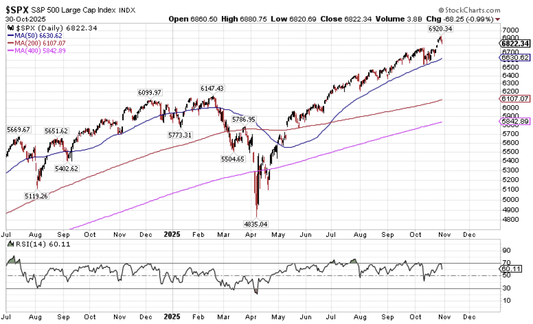 Let’s begin with the S&P 500 chart right above with the S&P 500 trading as much as +12% above its previous all-time highs set in February just before the tariff induced cascade to the downside.  As it stands today, the S&P 500 is trading 3% above its medium-term 50-day moving average (blue line).  It’s trading 12% above its long-term 200-day moving average (red line).  And it’s floating 16% above its ultra long-term 400-day moving average (pink line).  Put simply, we as overdue for a sustained correction if not an extended period of consolidation in about a year.  And we should not be at all surprised to see the S&P 500 drop by more than 1000 points over a one to three month period from its recent all-time highs, and it would represent nothing more than garden variety mean reversion as part of a continued long-term uptrend dating back more than three years now.  But given that we have mostly flown past the historically turbulent period from mid-August to mid-November with flying colors, we should reasonably expect that the U.S. stock market is going to continue to run hot through Thanksgiving and the Santa Claus rally period into early January 2026.  As a result, the magnitude of the next eventual garden variety, regression to the mean stock market correction is likely to only get bigger before we finally hit the brakes.