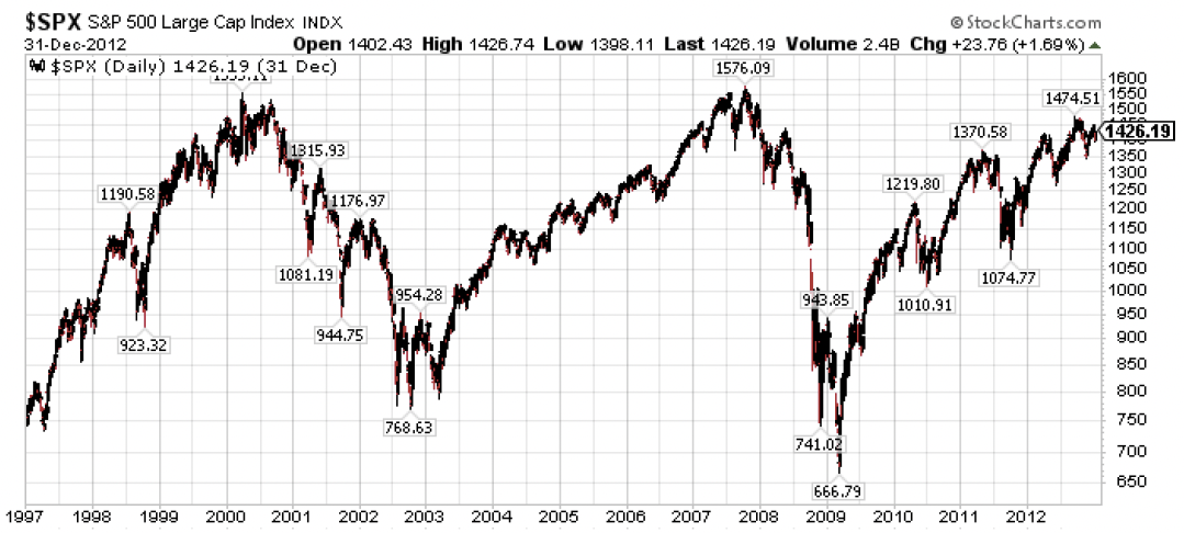 One last point getting back to stock market valuations.  If you want a guaranteed derisive eyeroll from in-the-know investors, start talking about the Shiller CAPE ratio (Cyclically Adjusted Price-to-Earnings ratio, or effectively the 10-year P/E on the S&P 500 Index).  I can barely restrain my own eyes darting to the ceiling as I type this point.  But here’s the thing we cannot ignore.  First, let’s get this out of the way.  The Shiller CAPE ratio is NOT a market timing instrument.  It’s not about what’s going to happen tomorrow, next week, or next year.  Instead, it is an ultra long-term indicator.  It gives us a measure of what we should reasonably expect over the next ten years.  What is the CAPE approaching 40 telling us today?  That the expected return on the S&P 500 over the next 10-years should come in around 1.6%.  The only time this reading has been lower was in 2000, 1970, 1937, and 1929.  It’s been four out of four in its past 10-year market return predictions.  But the more important point to note is that when generating a 1.6% annualized return over a ten year period, it almost never comes in a grinding slog of successive 1% to 2% returns each year over ten years.  Instead, it almost always comes with years that are down -20% to -40% followed by years that are up +15% to +30%.  A price chart from 1997 to 2012 is what it typically looks like.