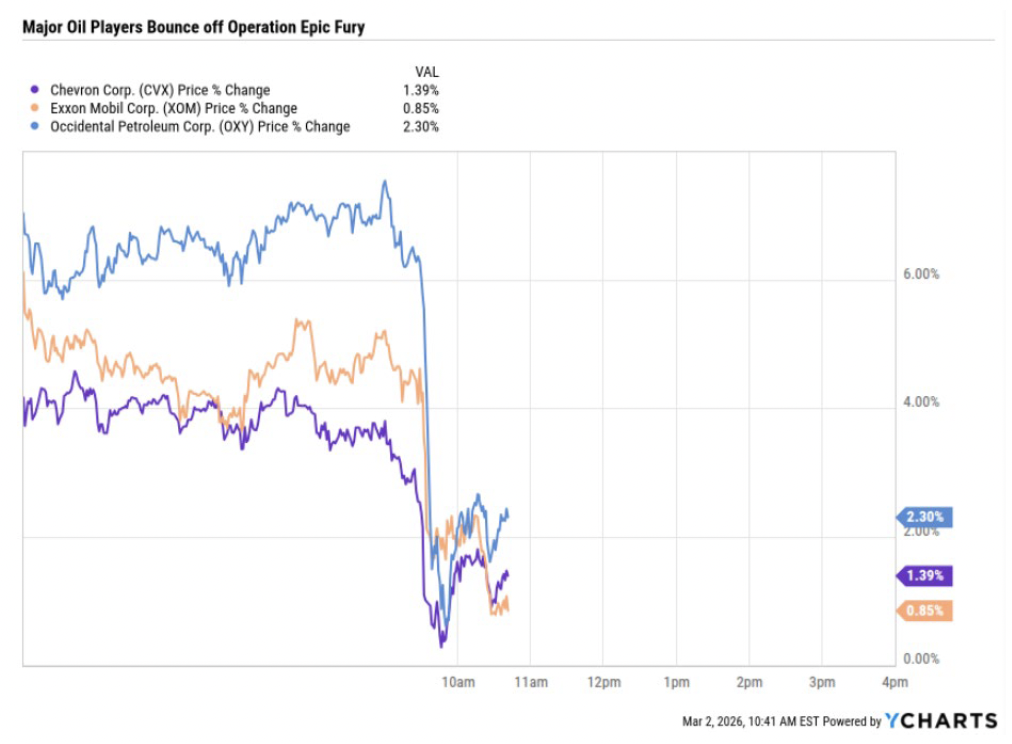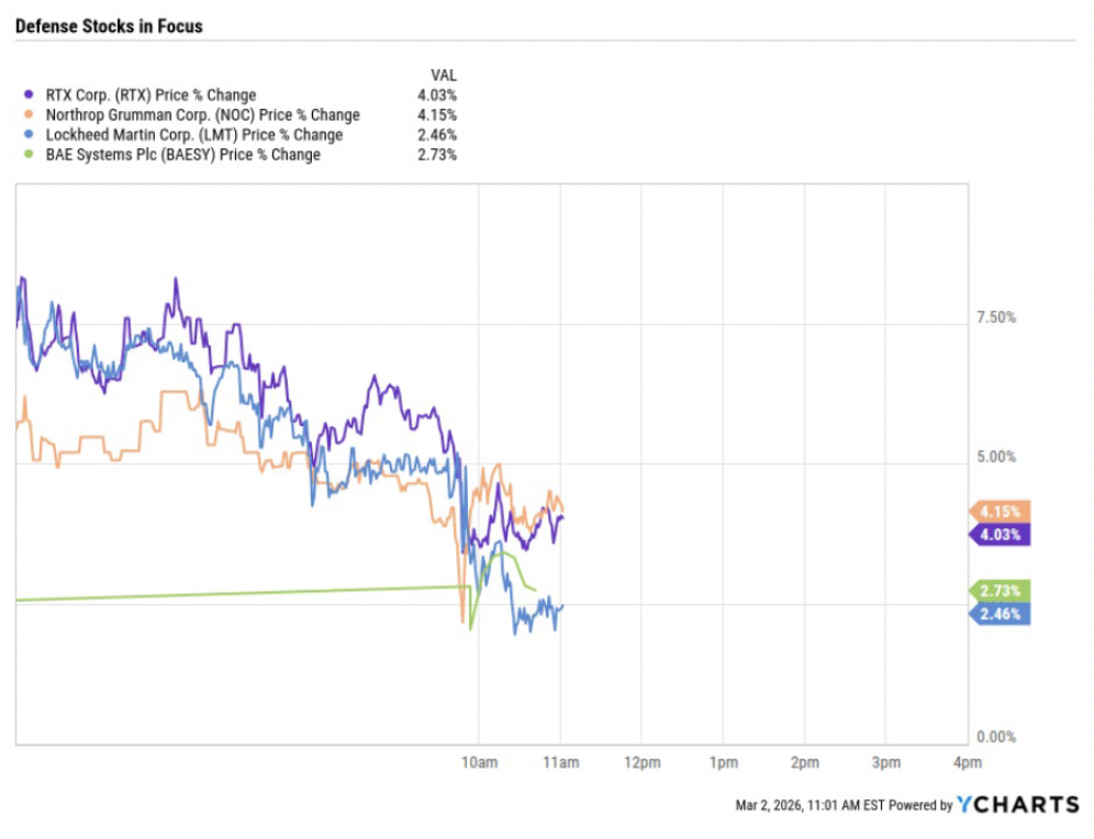 Defense stocks including RTX, Northrop Grumman, Lockheed Martin, and BAE Systems all bounced off the weekend news and ensuing comments from the President stating that the operation could last for “four to five weeks”. Citi analyst Charles Armitage stated, “The U.S./Israeli strikes on Iran and Iran’s subsequent retaliation are likely to increase investor focus on missile-defense systems, as well as a likely increase in U.S. spending.”