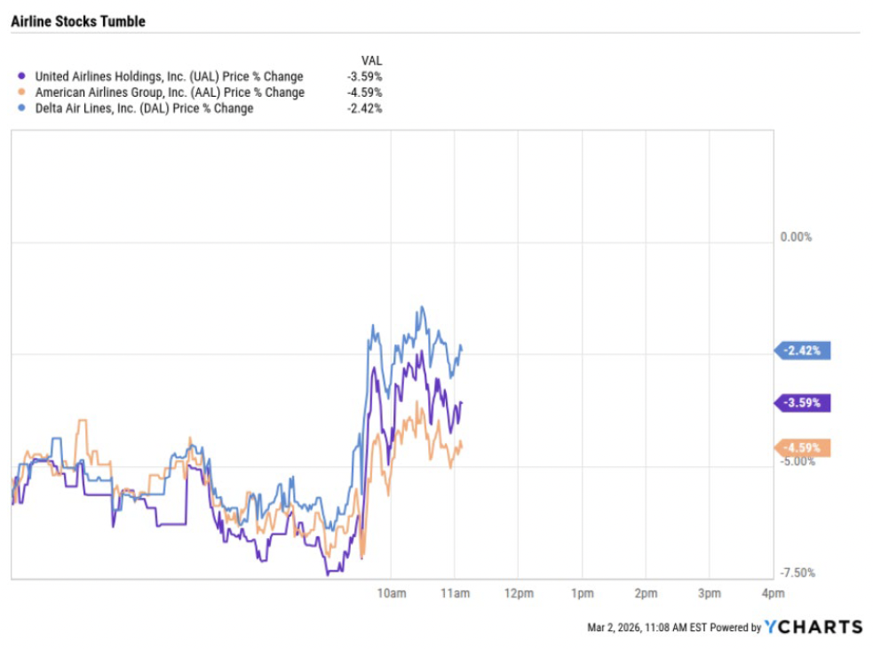 A less expected reaction in equities took place in the airlines sector. Airline stocks fell sharply during early trading as the conflict forced governments to shut down airports and cancel flights. On top of the logistical nightmare, higher oil prices will drive up the price of jet fuel, hurting profits. The conflict is also likely to force travelers to cancel or put off trips, particularly on international flights. Shares of American Airlines, United Airlines, and Delta all fell sharply with UAL and AAL each down more than 3.50%.