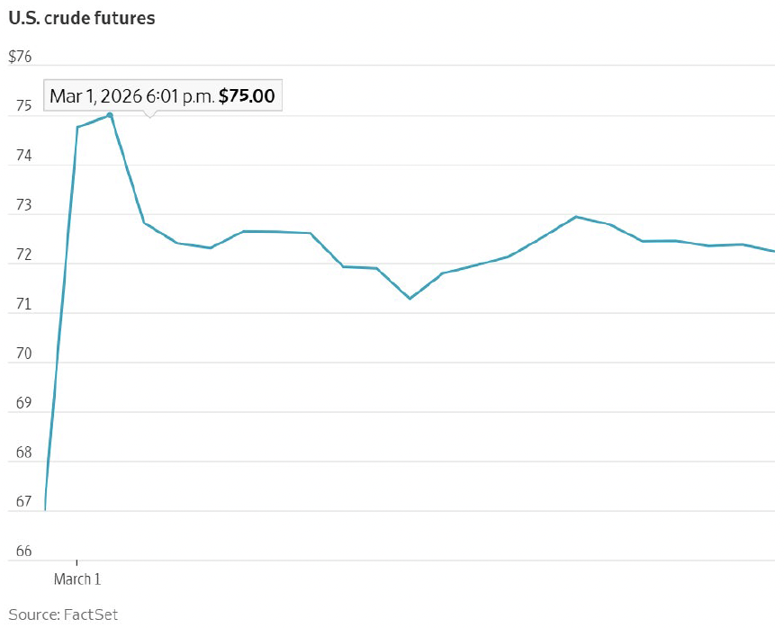 The most visceral reaction to the weekend’s events took place in the commodities market, specifically oil. On Sunday oil prices surged with U.S. crude futures rising as much as 11%, trading as high as $75 a barrel, Brent futures, the global price gauge, jumped 8%, to roughly $79 a barrel. The back and forth strikes over recent days have thrown one of the world’s key shipping routes for energy into the crossfire. Iranian officials and media have shared conflicting statements about the status of Strait of Hormuz, but as of noon today the shipping route remains open. The key oil shipping lane, which accounts for 20% of the world’s daily oil volume, is vital to keep open in order for oil prices to remain in check. As of Sunday night, three ships were attacked near the Strait of Hormuz, with Iran continuing to launch strikes across the Middle East in response to the U.S. and Israel. Two vessels have been struck, and an unknown projectile was reported to have exploded near a third according to the UK Maritime Trade Operations Center.