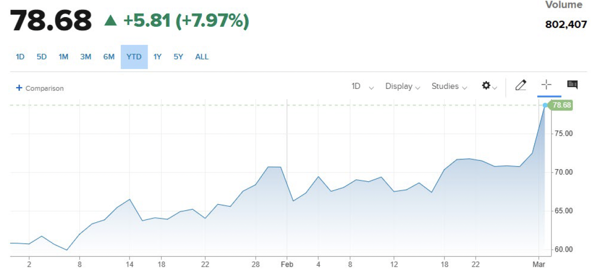 At market open on Monday ICE Brent Crude continued to hover around $79 a barrel and was up 8%.